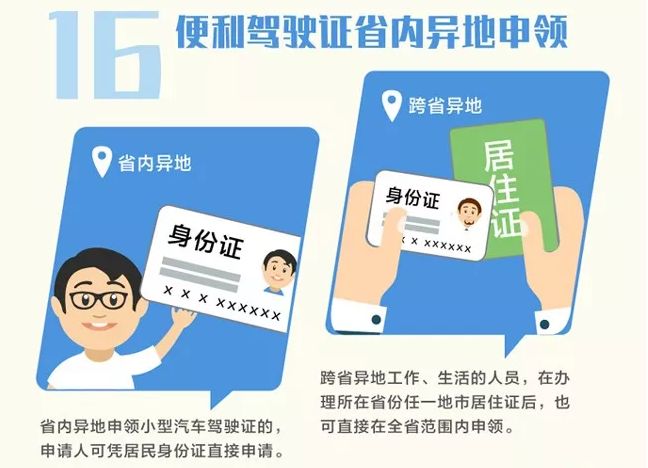 16、便利驾驶证省内异地申领。放宽小型汽车驾驶证异地申领条件,2018年9月1日起,本省(区)申请人可凭居民身份证直接申请;跨省(区)异地申请人在办理所在省(区)任一地市居住证后,也可直接在全省范围内申领。